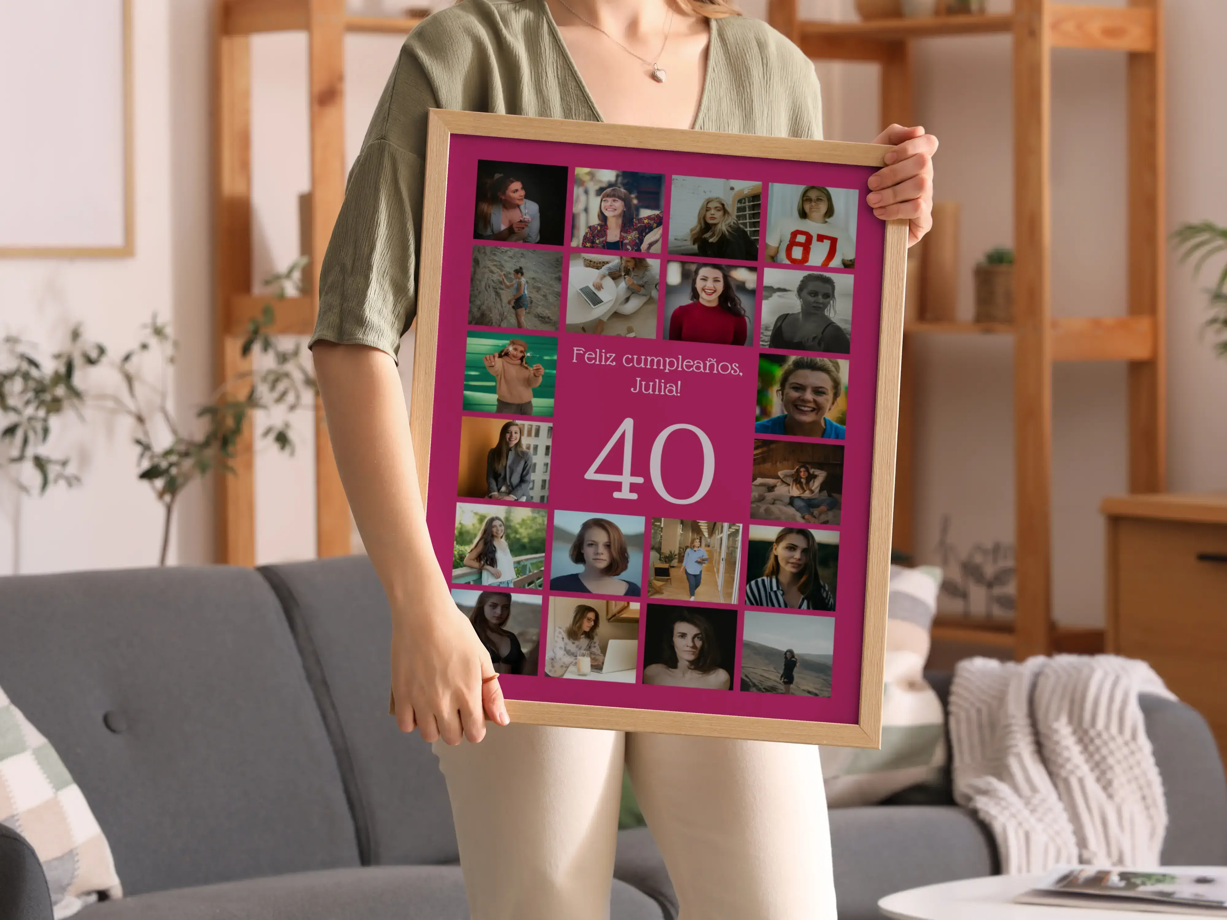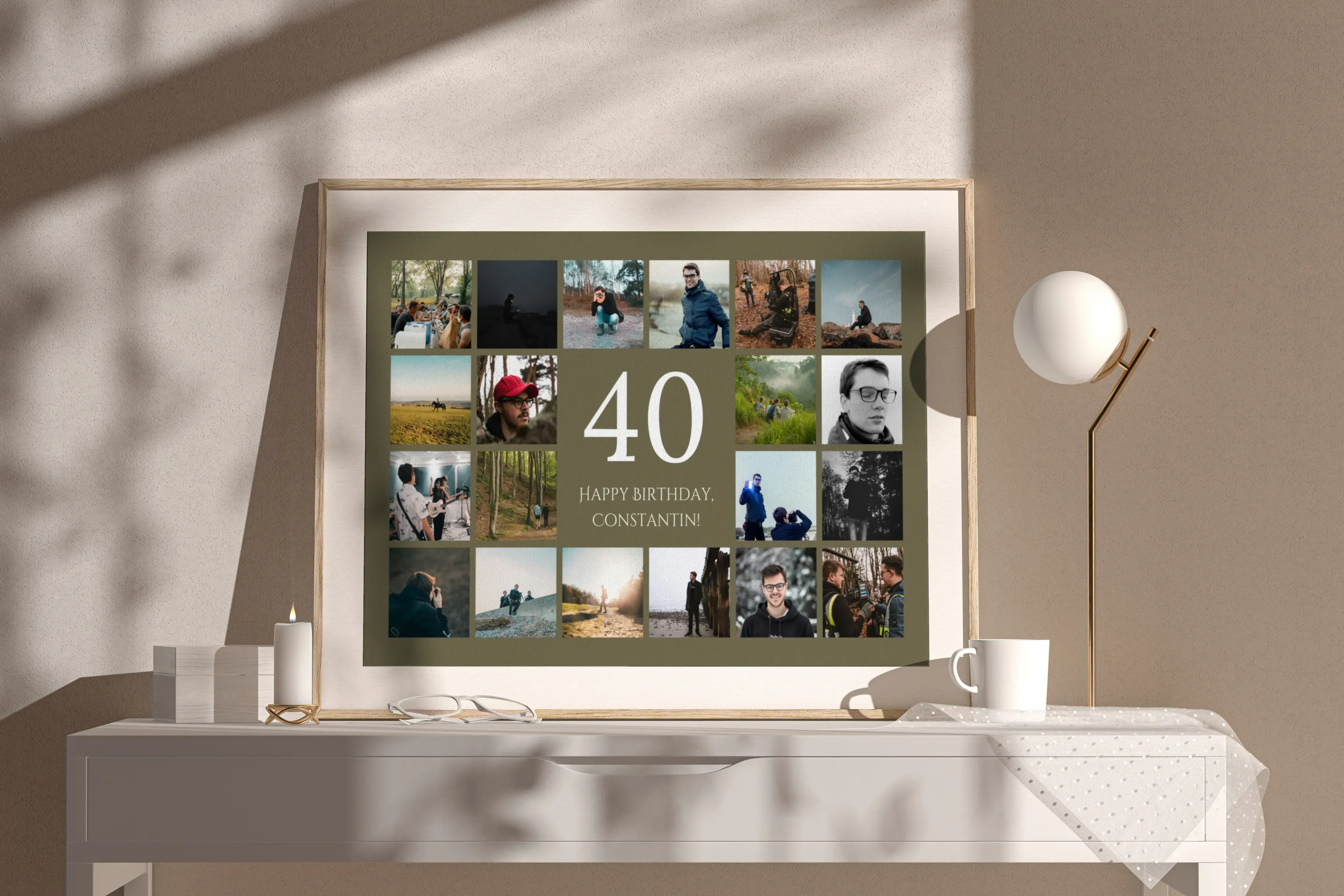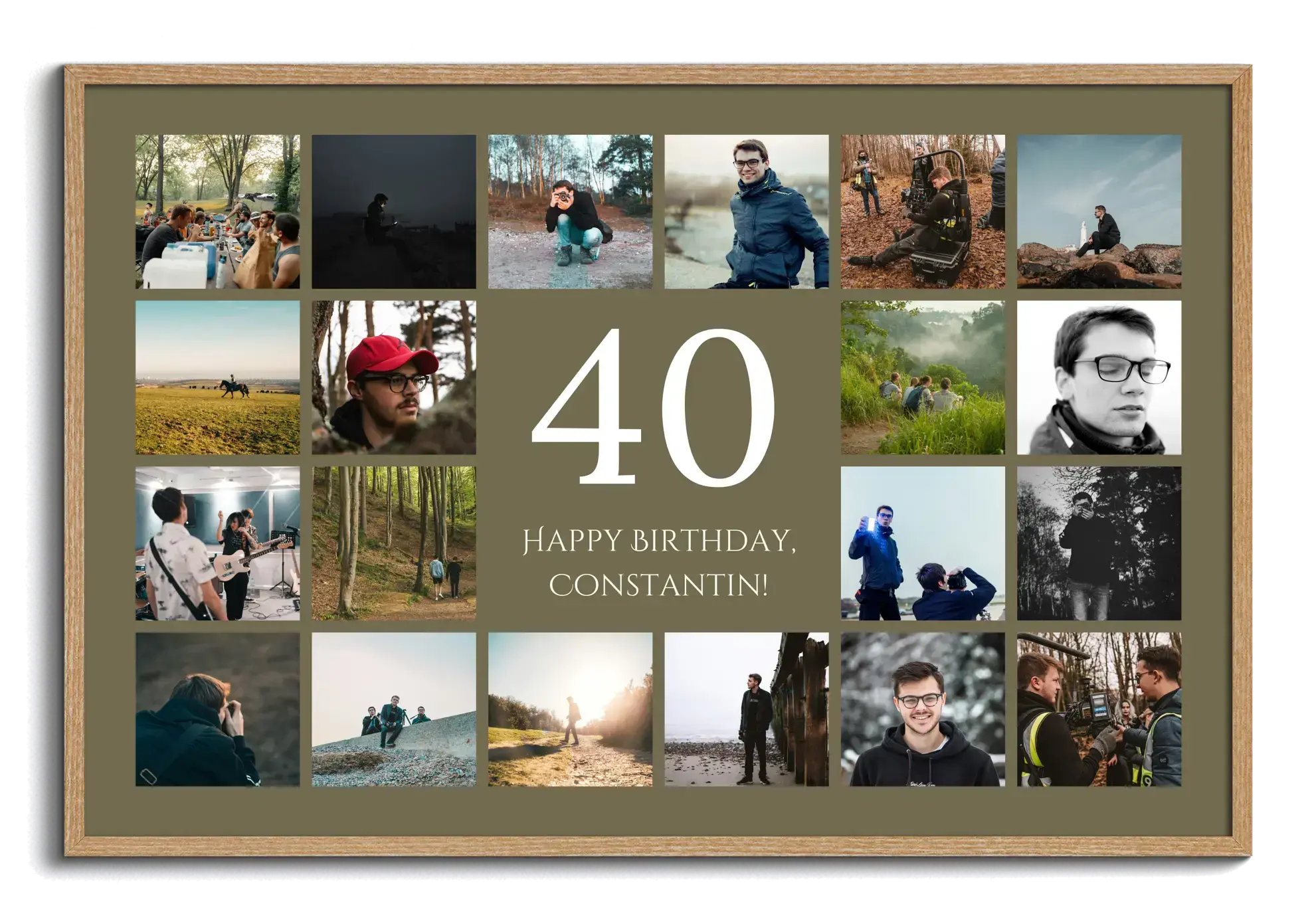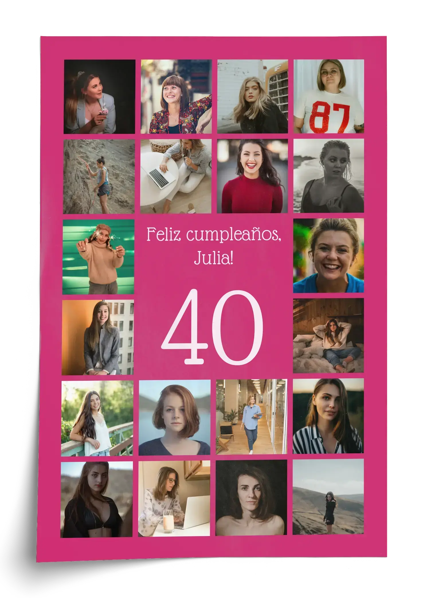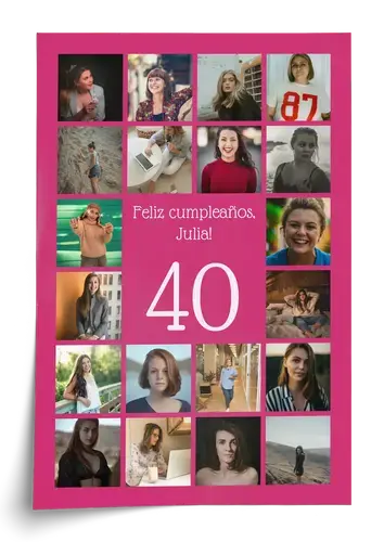 Collage 40 con nombre, saludo y 20–80 fotos: perfecto para 40º cumpleaños, aniversario o empresa.