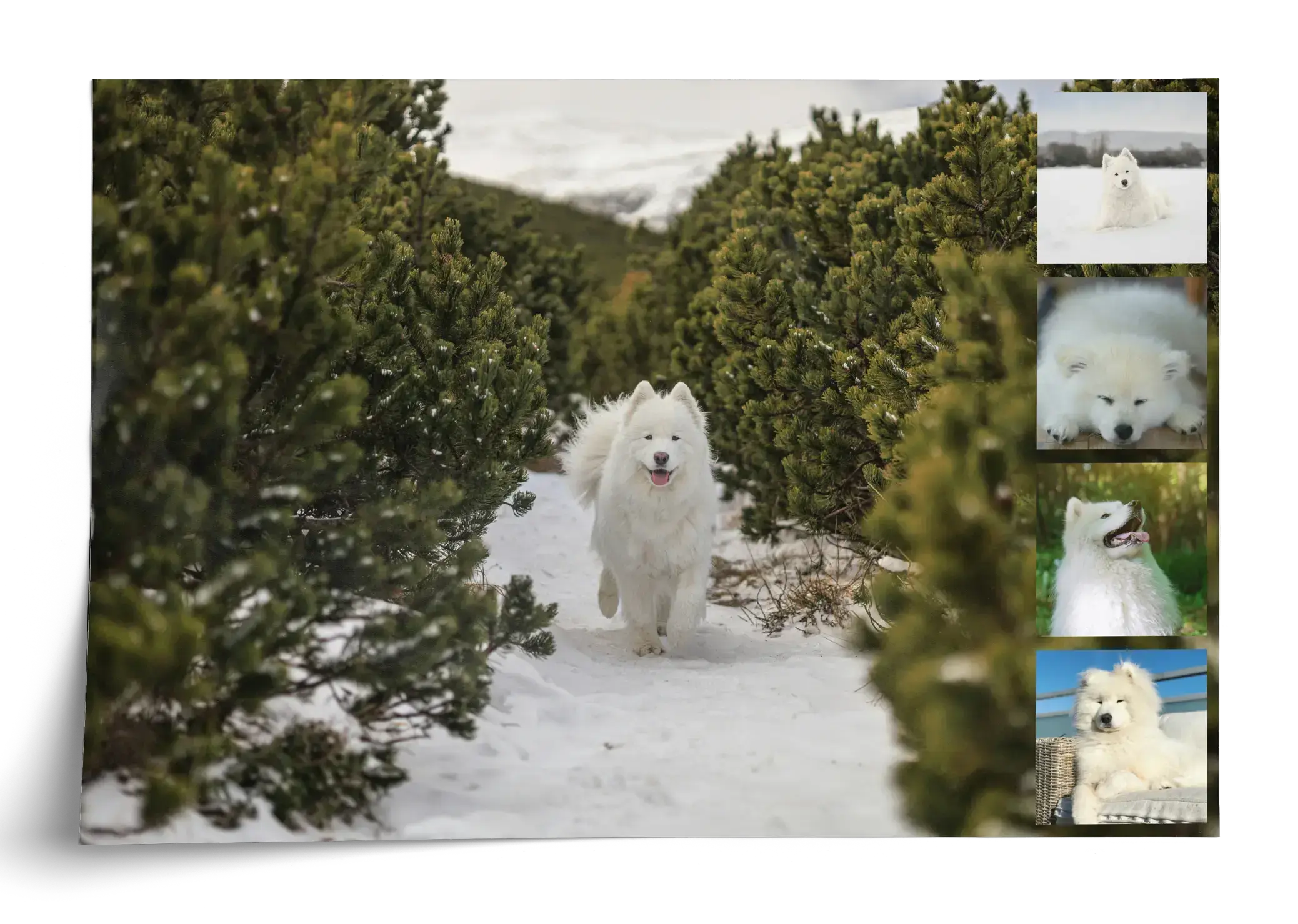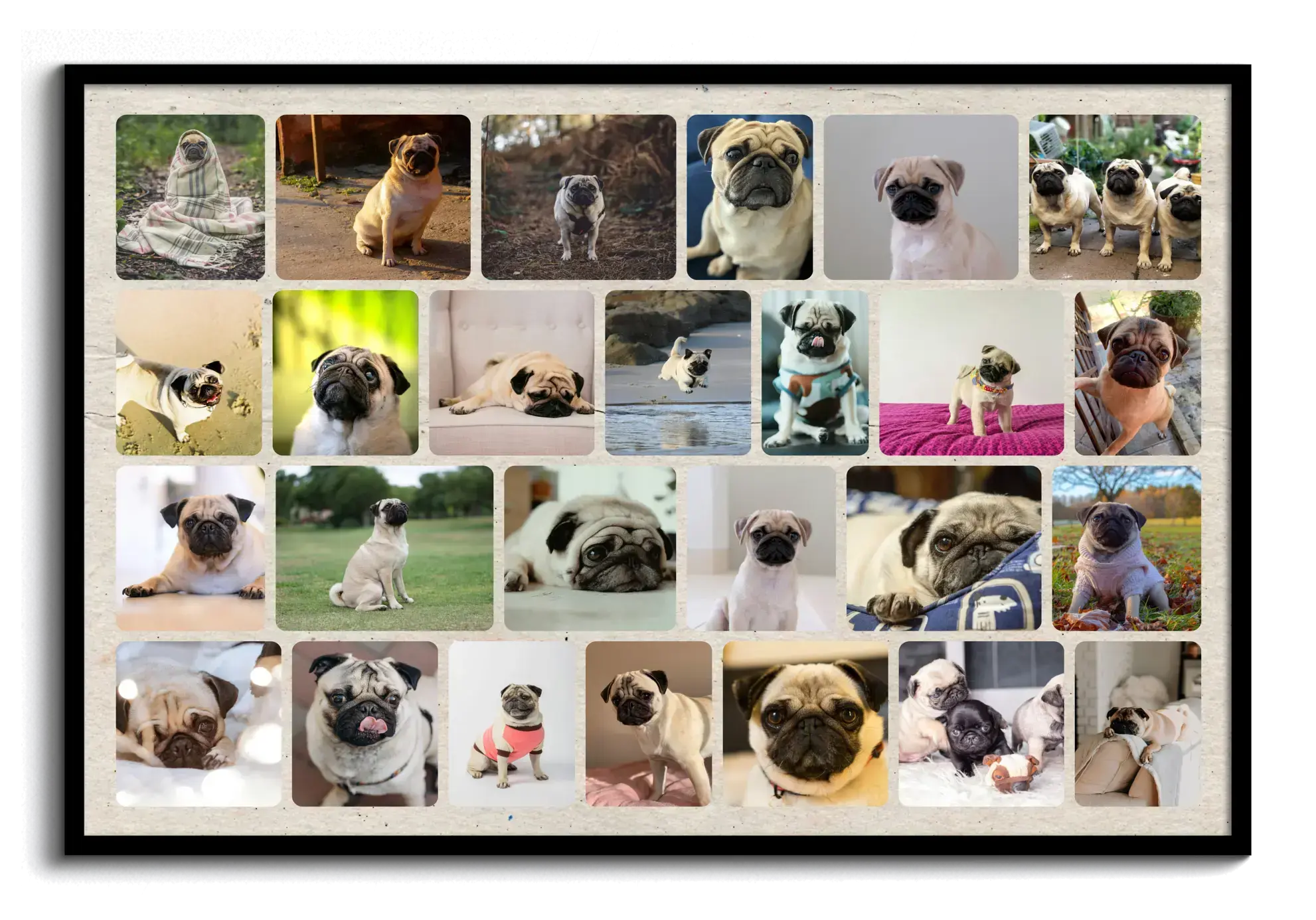 Crea ahora tu fotocollage de perro y convierte tus mejores fotos en un recuerdo muy personal. Este diseño te permite reunir retratos, momentos de juego y miradas inolvidables en una composición hecha a tu gusto: estilo Polaroid, con texto o sin él, en filas, cuadrícula o con una imagen grande de fondo.