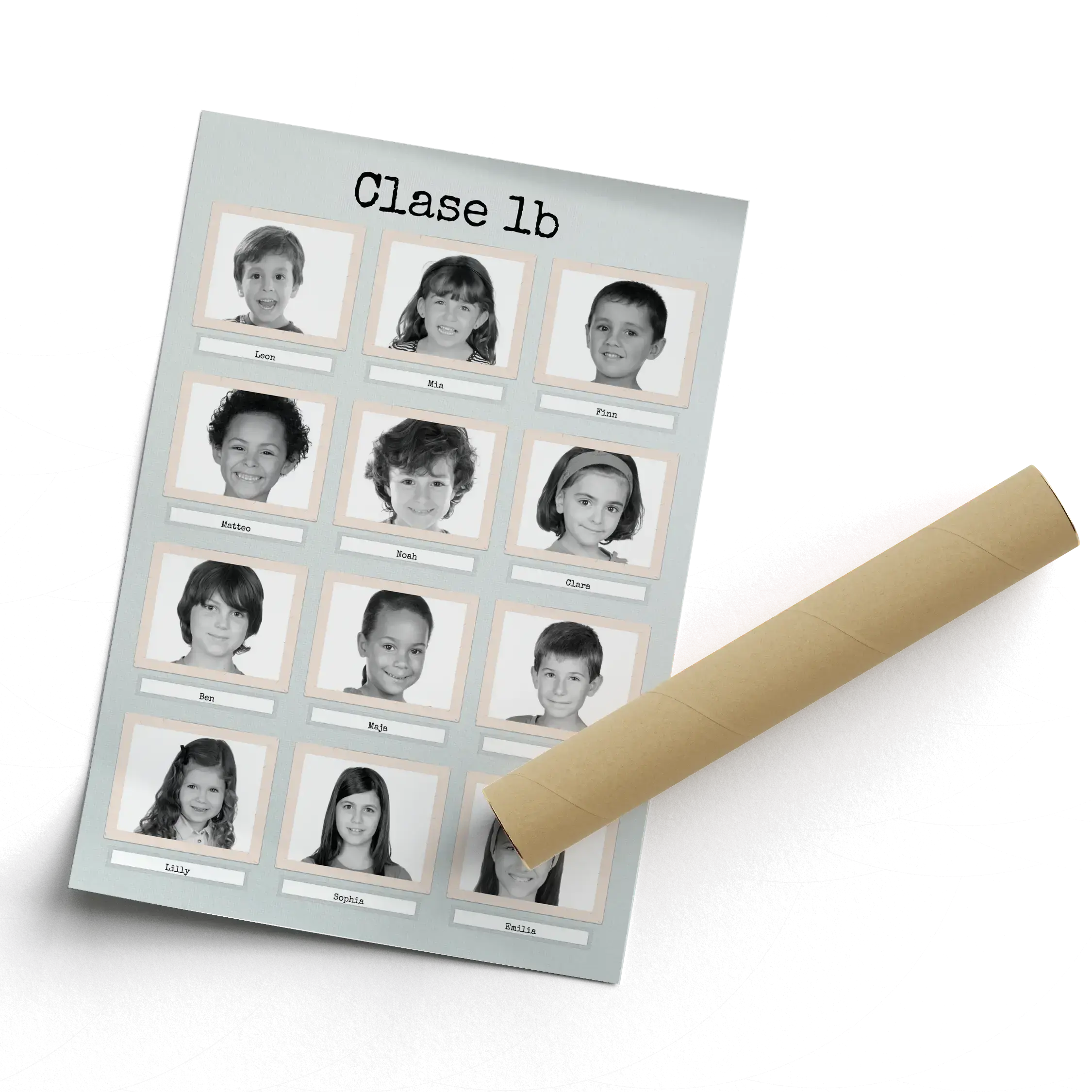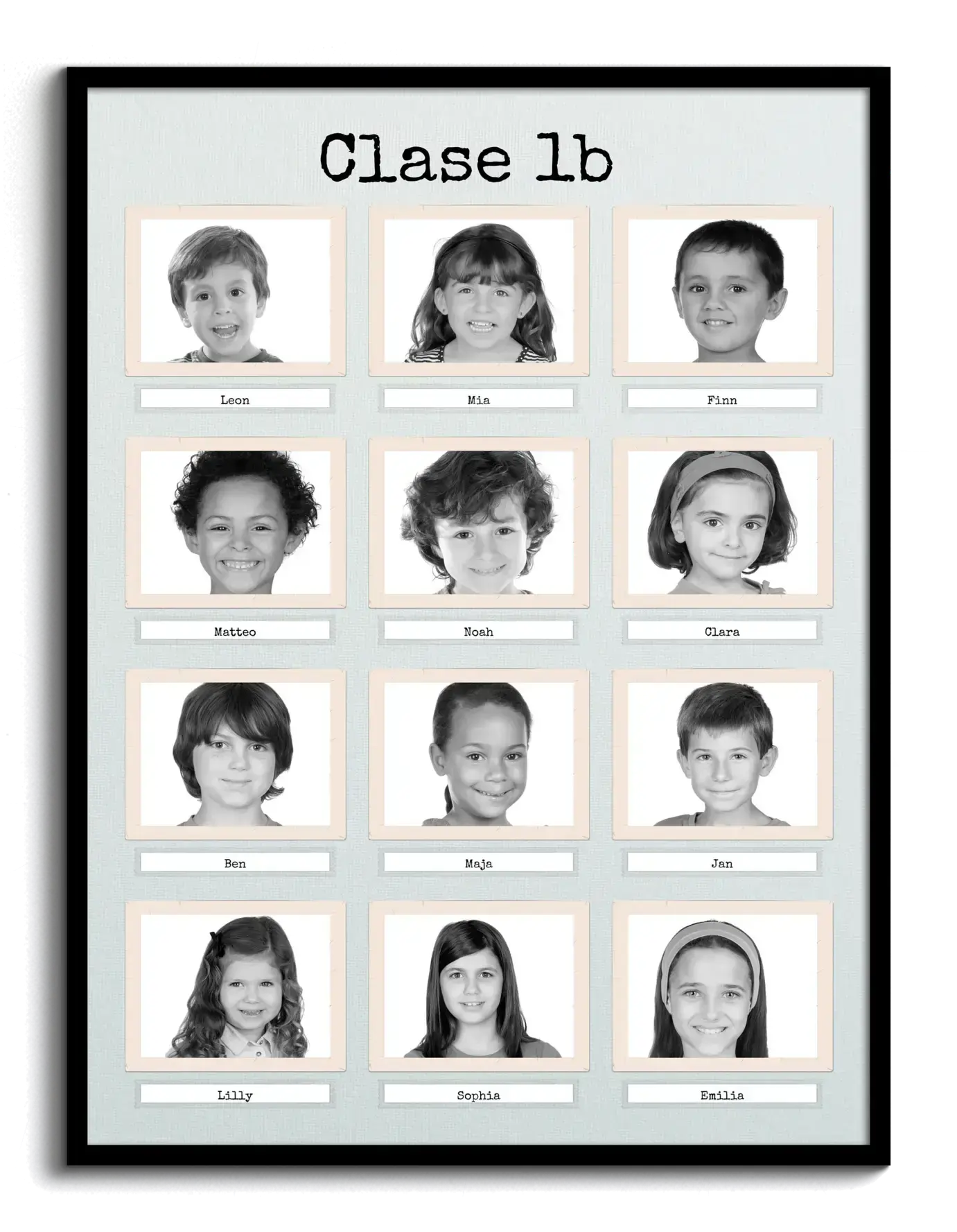 Crea tu propia fotocollage personalizada y dale vida a tus recuerdos de manera única. Este producto, diseñado para capturar momentos especiales como una clase de primaria, permite mostrar 12 fotos en estilo retro blanco y negro, con los nombres de los niños y textos adicionales como "Clase 1b". Es un regalo ideal para profesores, educadores o una inolvidable memoria para los padres.