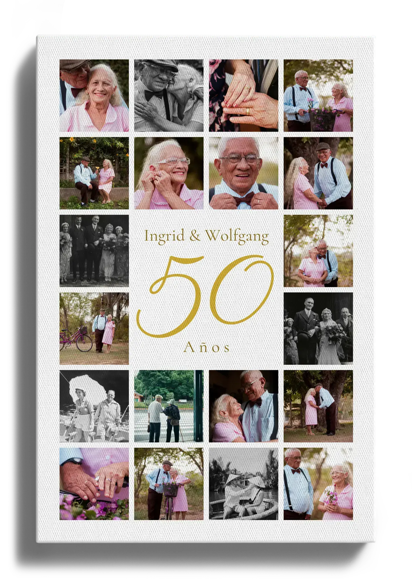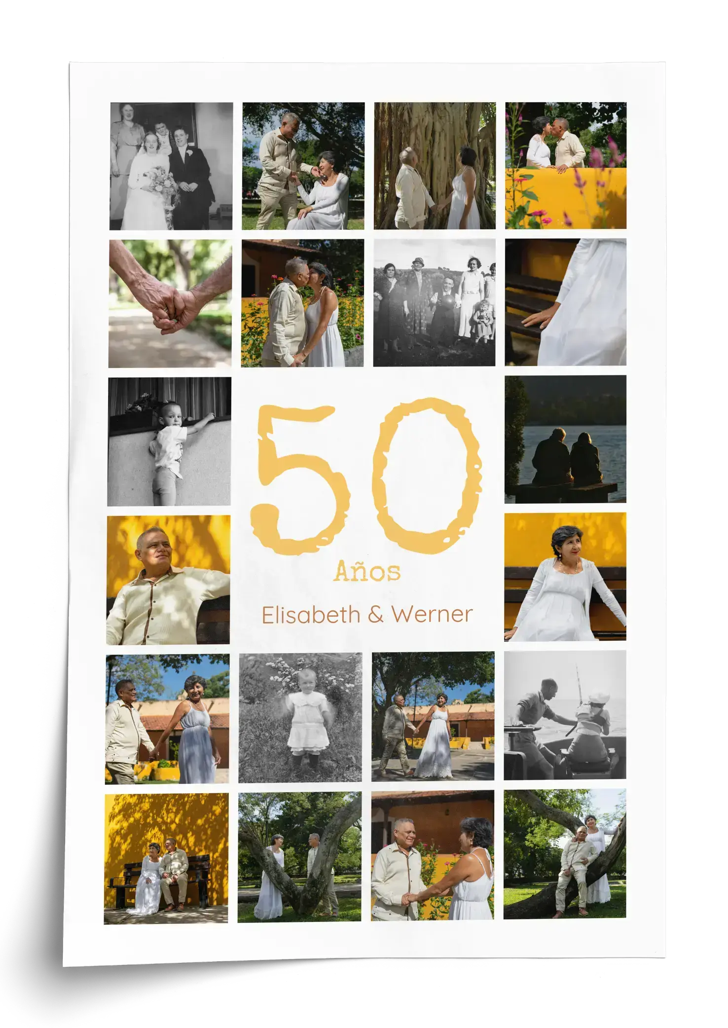 Empieza ahora: crea una lámina de Bodas de Oro con una gran 50 en el centro, los nombres arriba y un breve mensaje con la fecha debajo. La rodean 20–80 fotos en cuadrícula uniforme. Personaliza número, nombres, texto, cantidad de fotos, fondo, colores y formato vertical u horizontal.