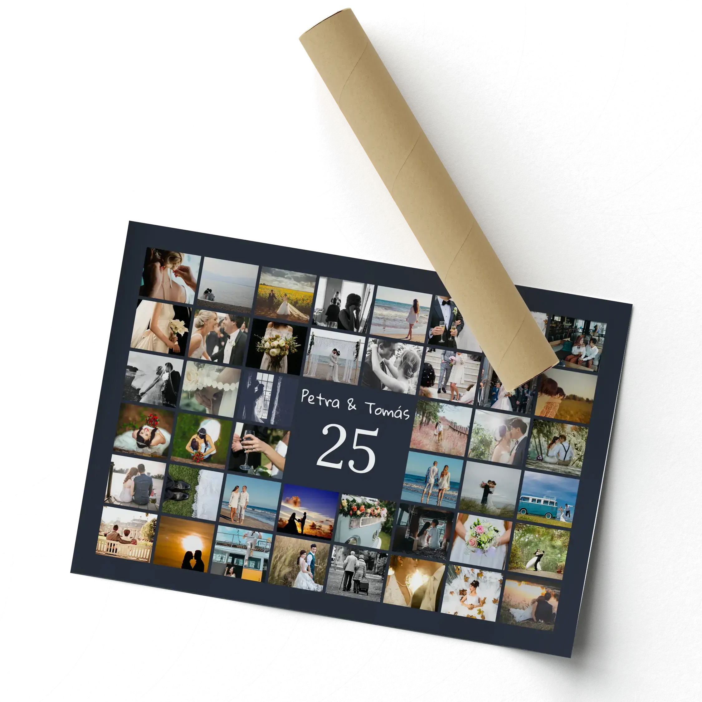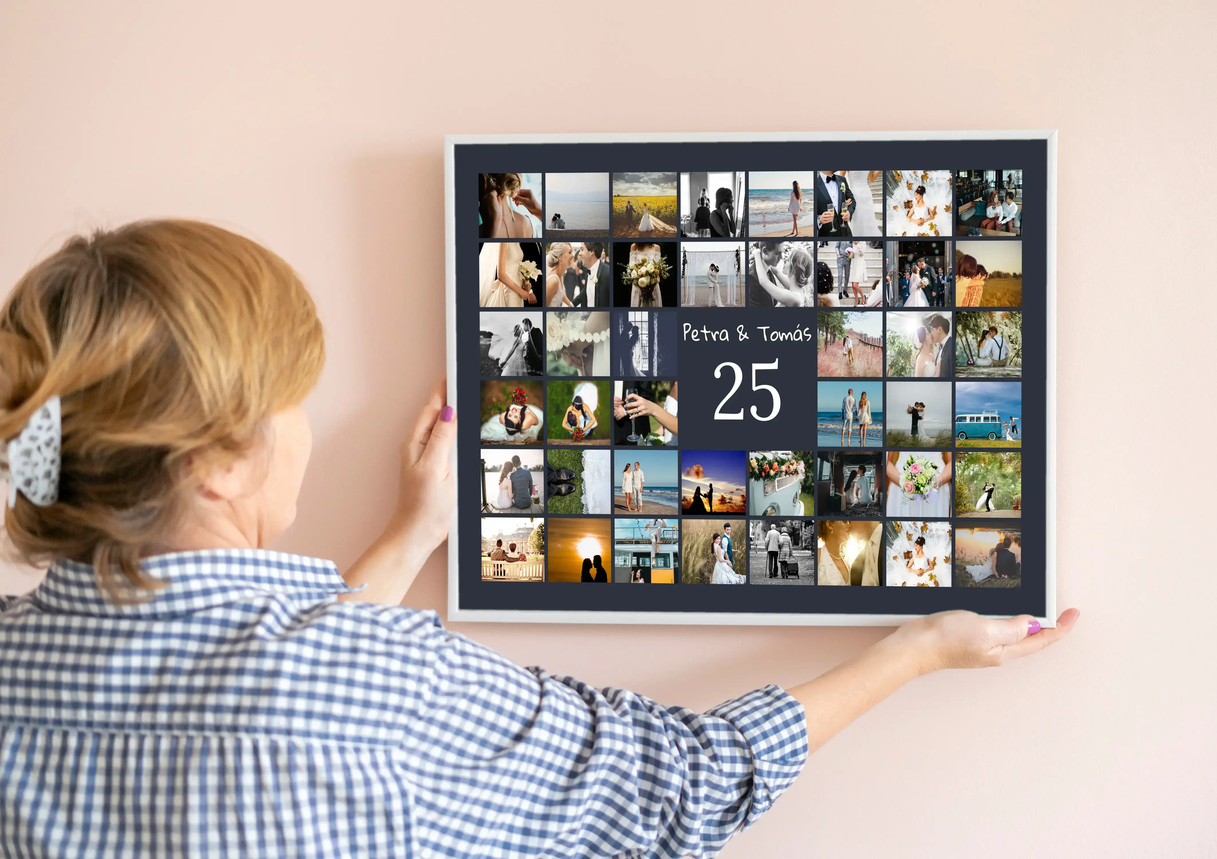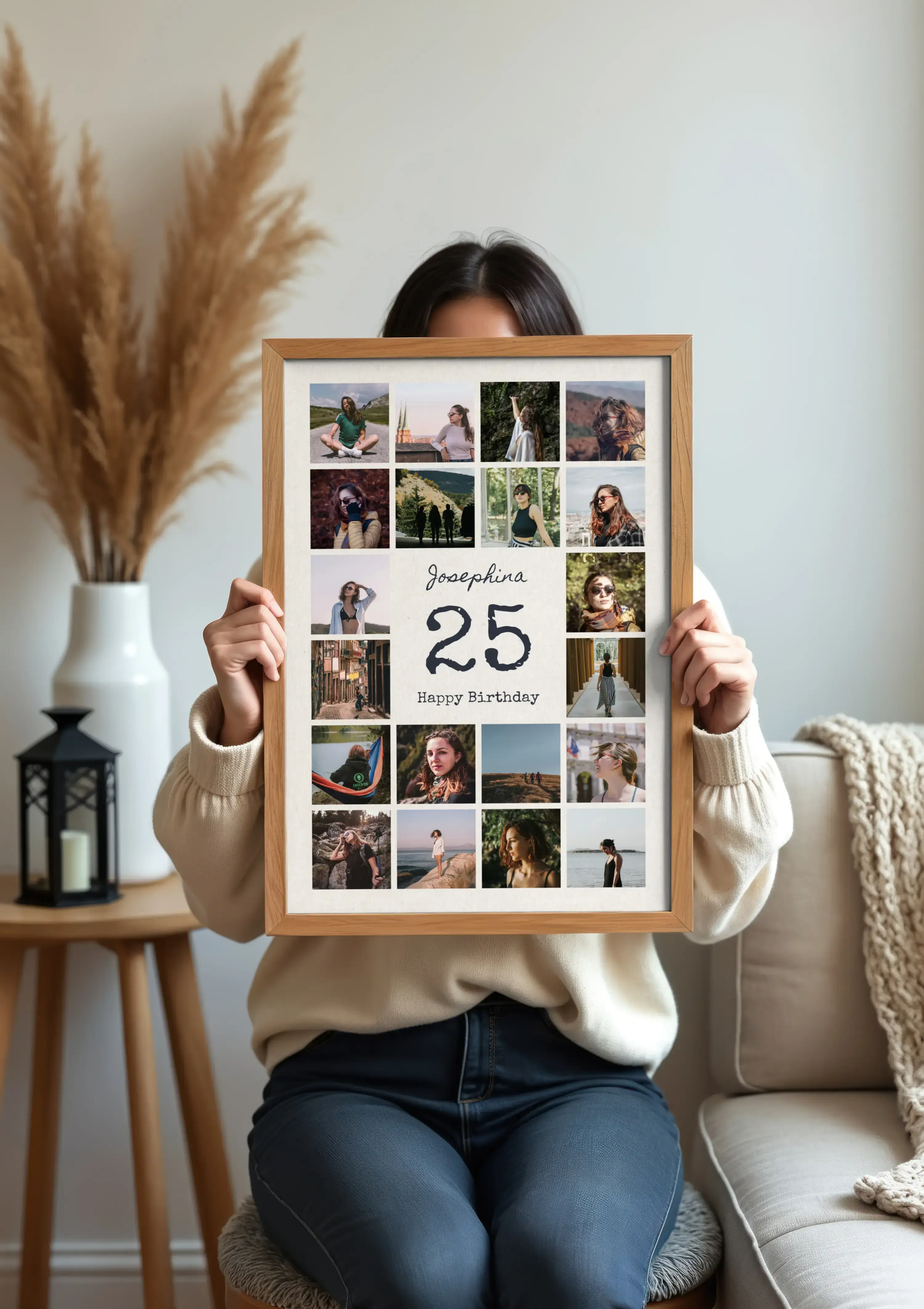 Collage 25 personalizable con 20–80 fotos; ideal para bodas de plata o 25º cumpleaños.