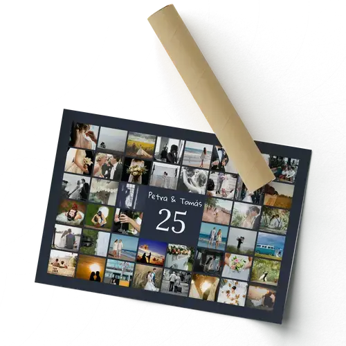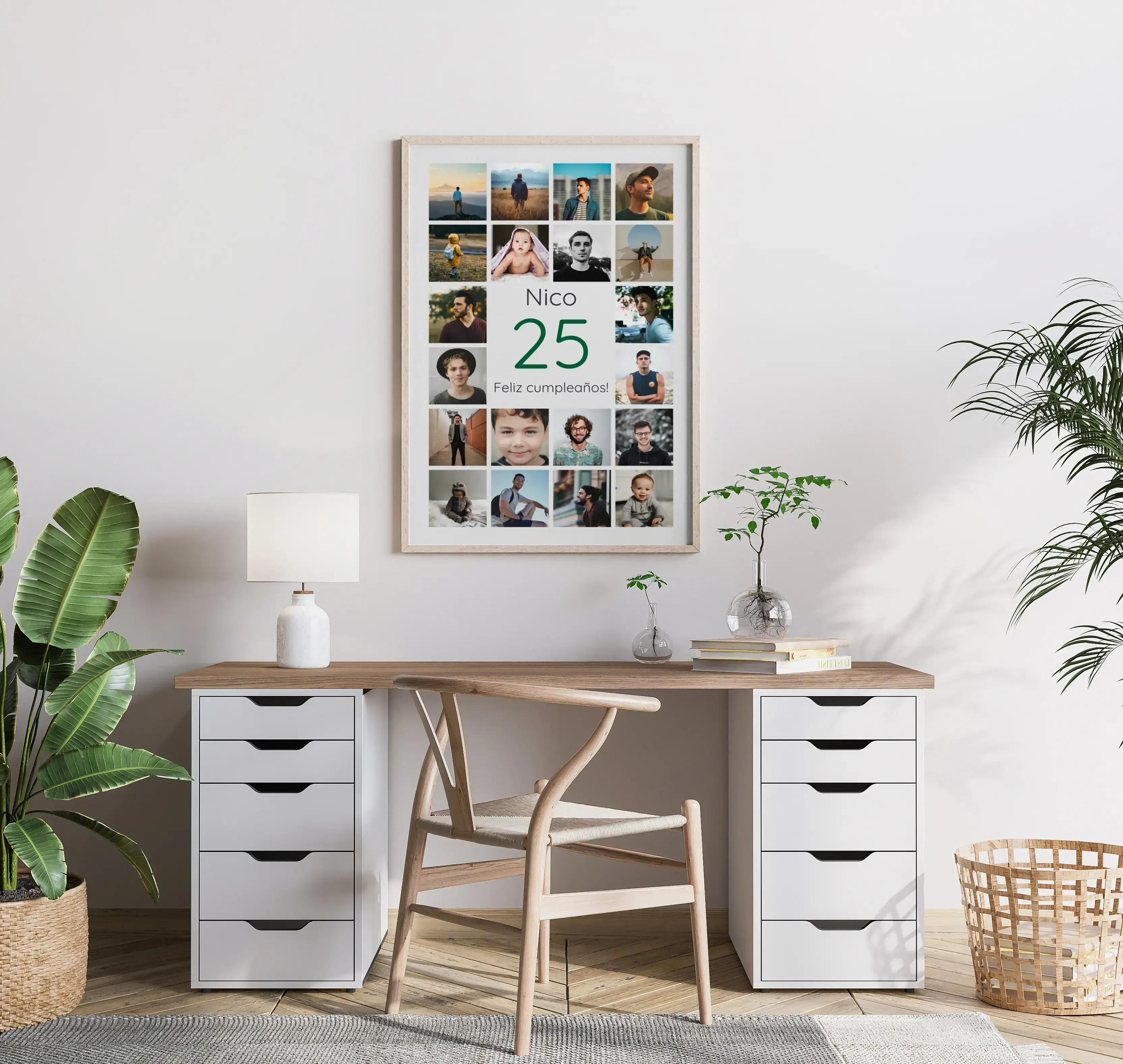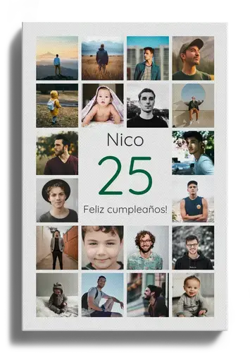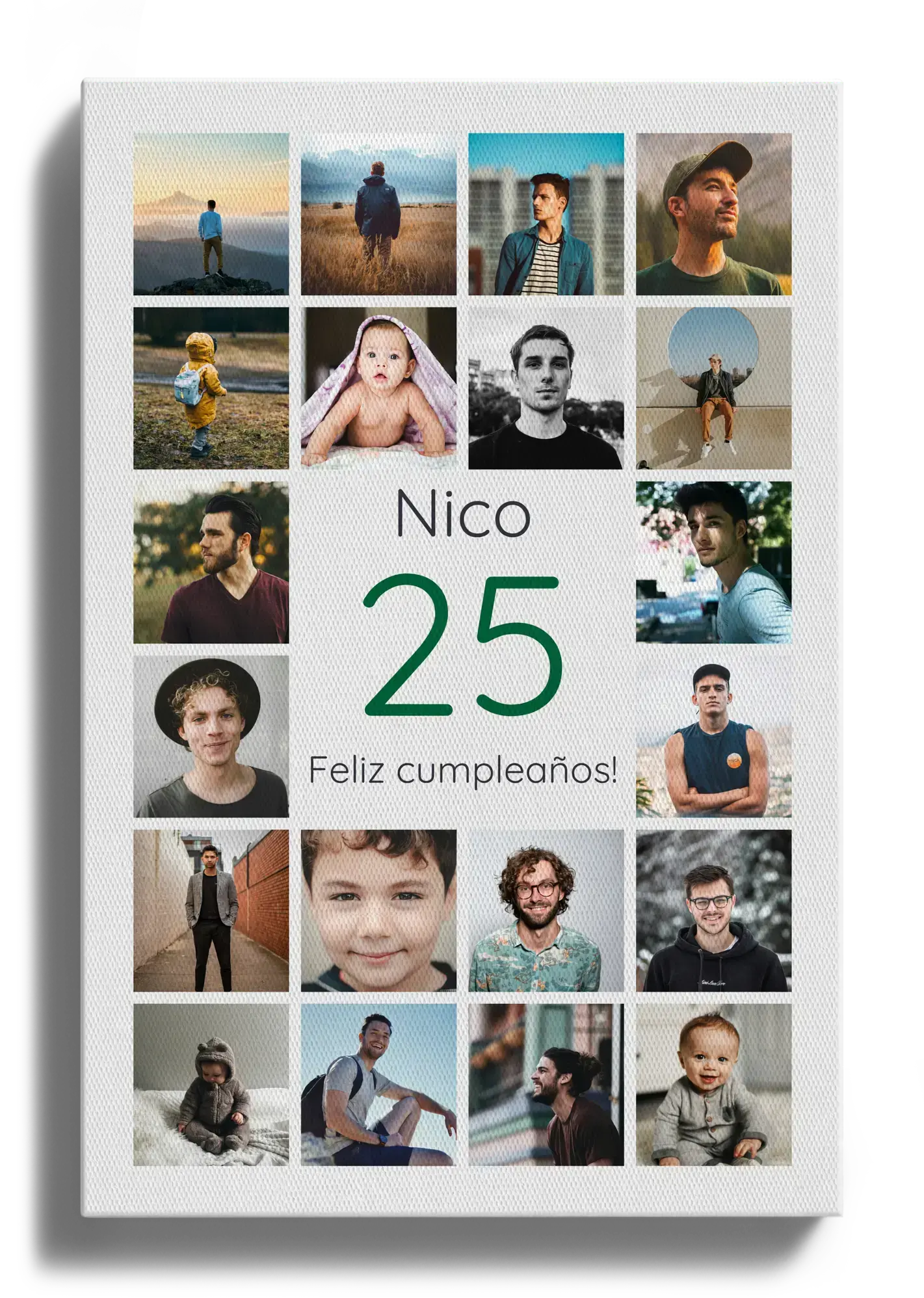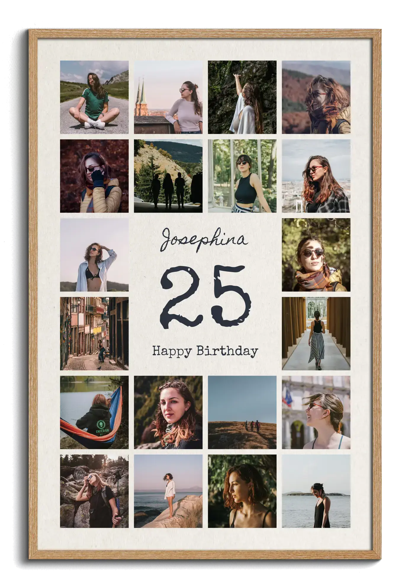 Collage 25 personalizable con 20–80 fotos; ideal para bodas de plata o 25º cumpleaños.