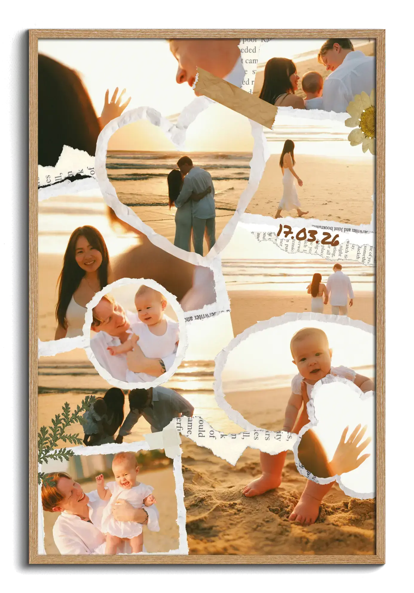 Esta plantilla ofrece muchas posibilidades de personalización. Puedes elegir el número de fotos, adaptar el tamaño, cambiar la disposición, usar orientación vertical u horizontal y añadir nombres, fecha o una frase breve. El estilo scrapbook aporta un aspecto artesanal con piezas que parecen recortadas, detalles decorativos y una composición pensada para dar protagonismo a tus recuerdos.