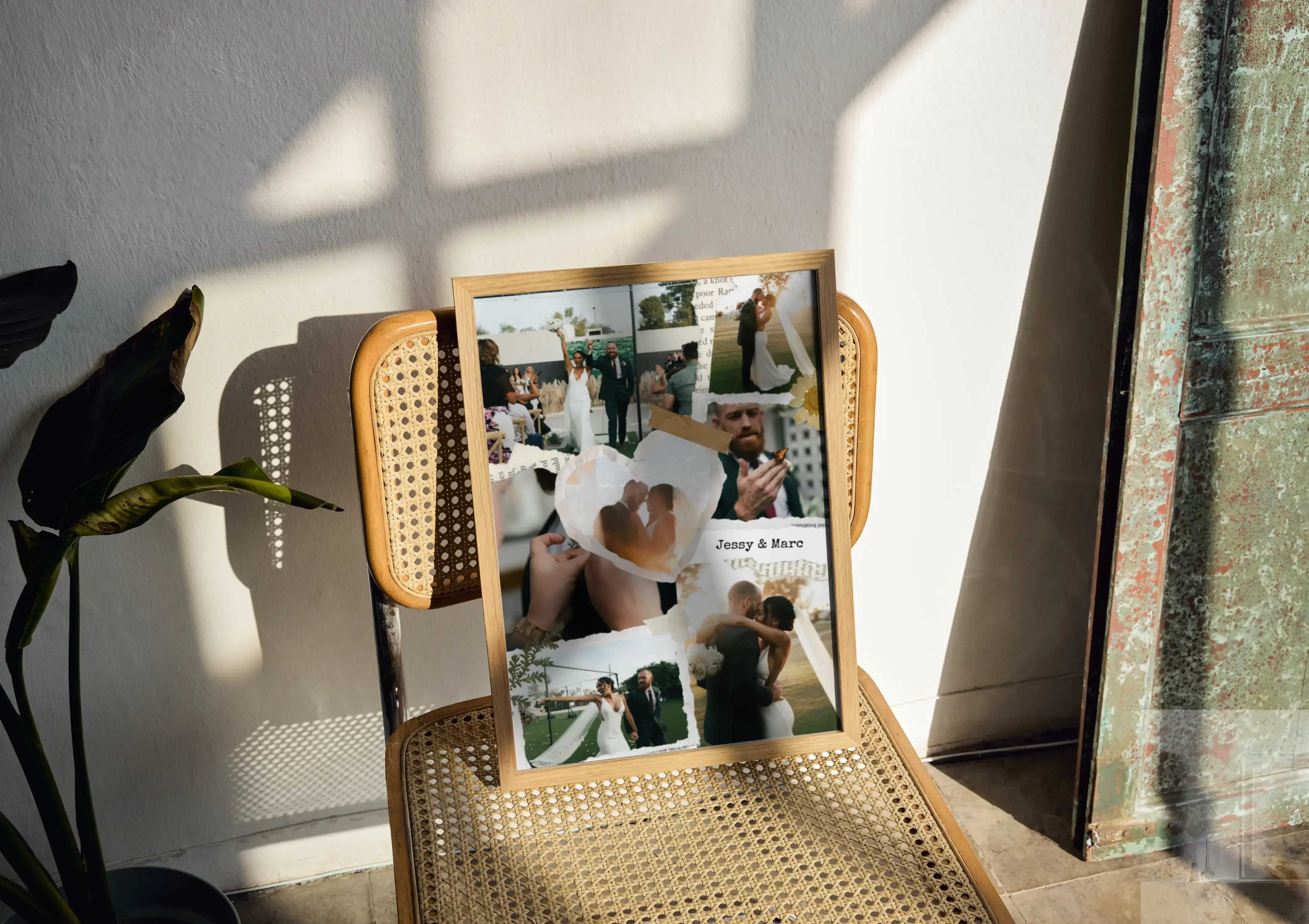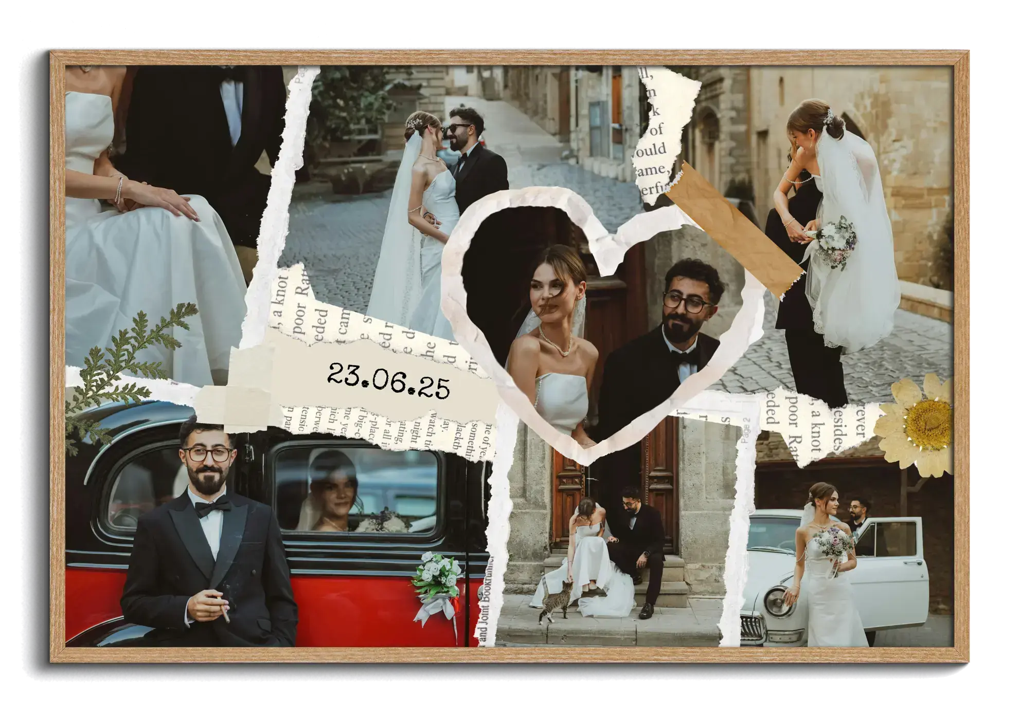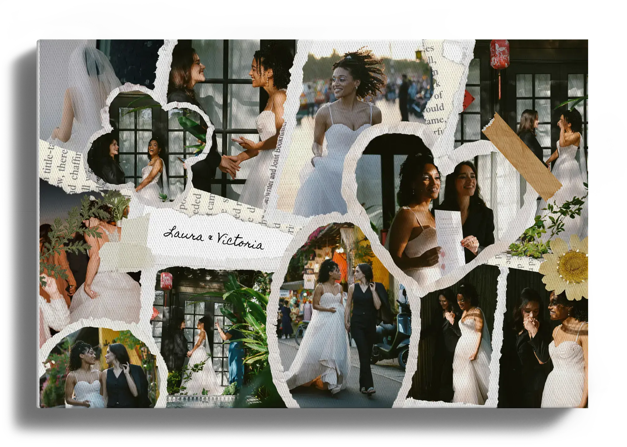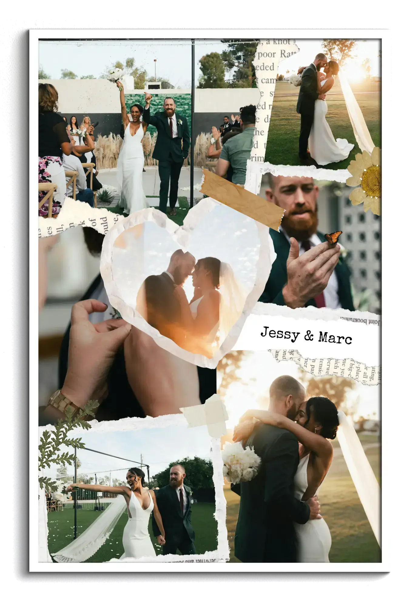 Collage de boda y compromiso en estilo scrapbook, creativa y emotiva, en horizontal o vertical.