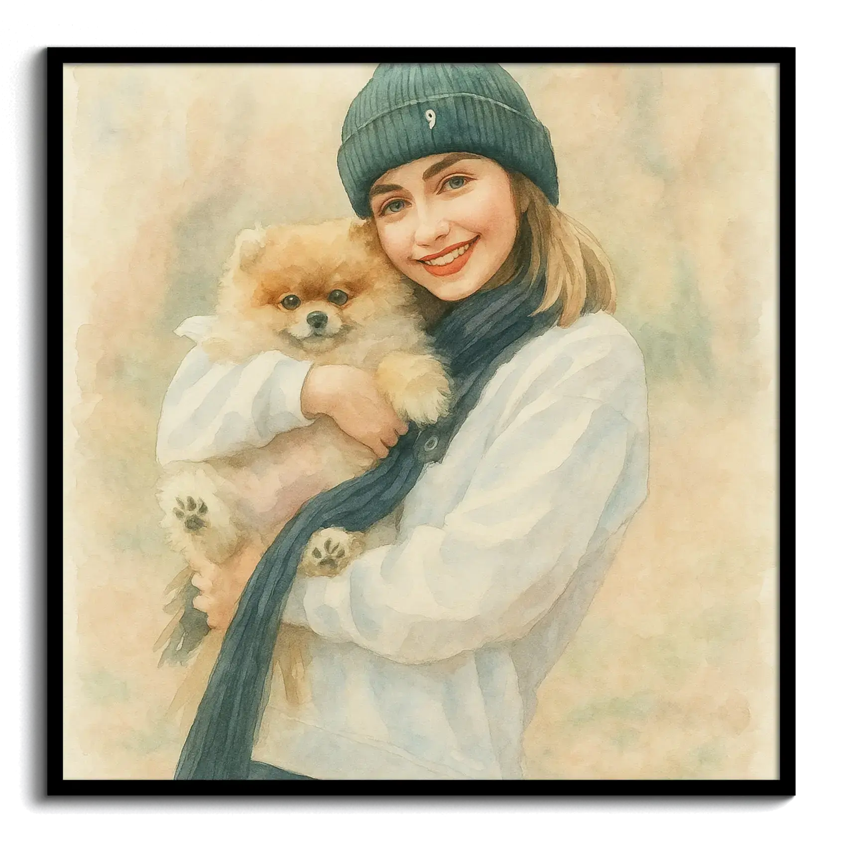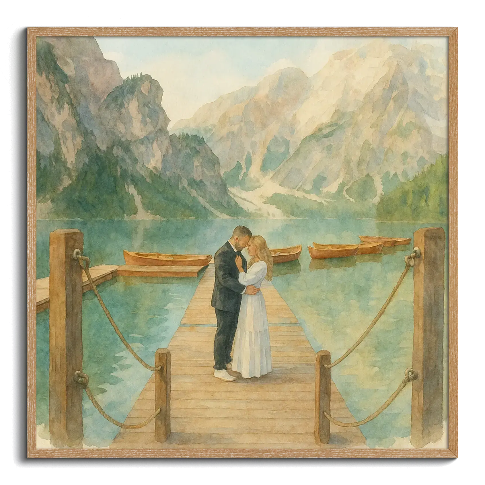Aquí ves un ejemplo: un retrato convertido con IA al estilo acuarela, ideal para Foto mit KI umwandeln, con pinceladas suaves y tonos pastel que conservan los rasgos originales. Puedes solicitarlo tal cual o crear el tuyo al subir tu foto y elegir tamaño y material: póster, marco, lienzo, acrílico, Alu‑Dibond, foam o descarga.