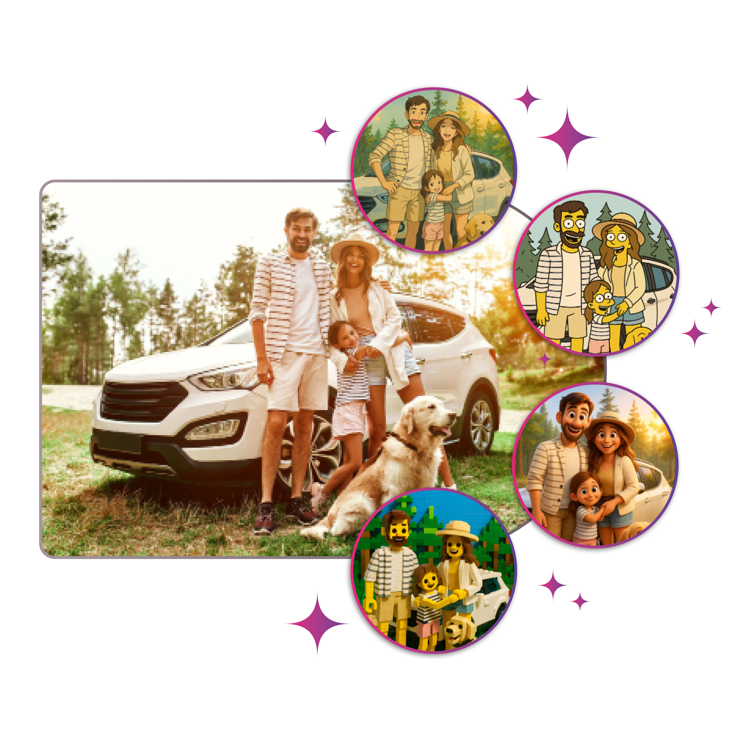 Tú decides el diseño: número de fotos, tamaños y plantillas como rejilla, corazón, texto o números. El resultado de IA puede ser el motivo principal de tu composición y combinarse con más imágenes, fondos, marcos, colores y tipografías. Además del anime, puedes transformar tu foto a estilos retro flat vector, Simpsons, Pixar, LEGO, Marvel, Ghibli, acuarela, Disney clásico o estilo sticker.
