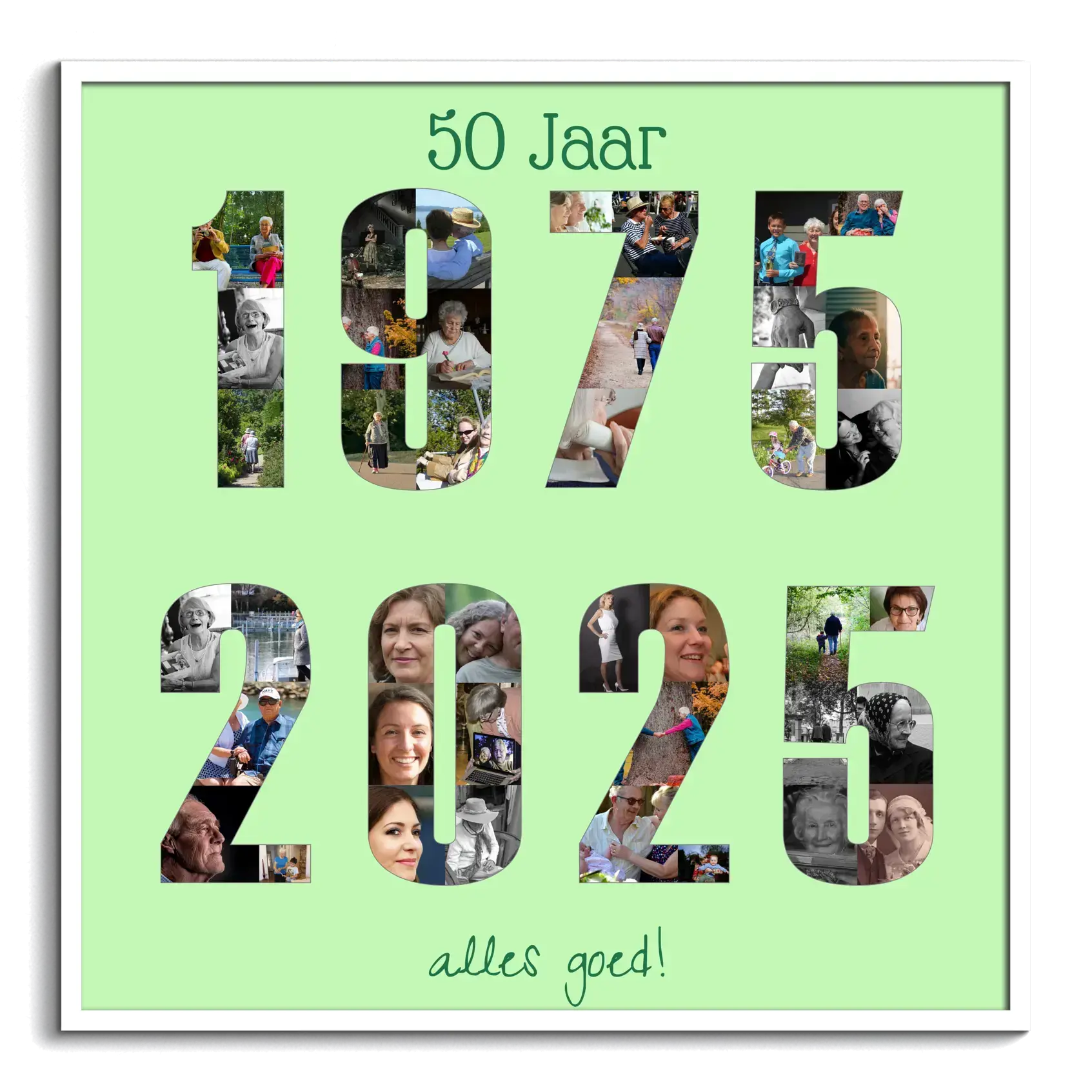 Empieza ahora y crea tu collage de cifras con tus fotos. Este diseño muestra dos años, por ejemplo 1975–2025, formados por muchas fotos pequeñas que rellenan las cifras y un texto editable, como 50 años, muchas felicidades. Ideal para cumpleaños o aniversarios de familia, amigos o pareja, listo para decorar y recordar.