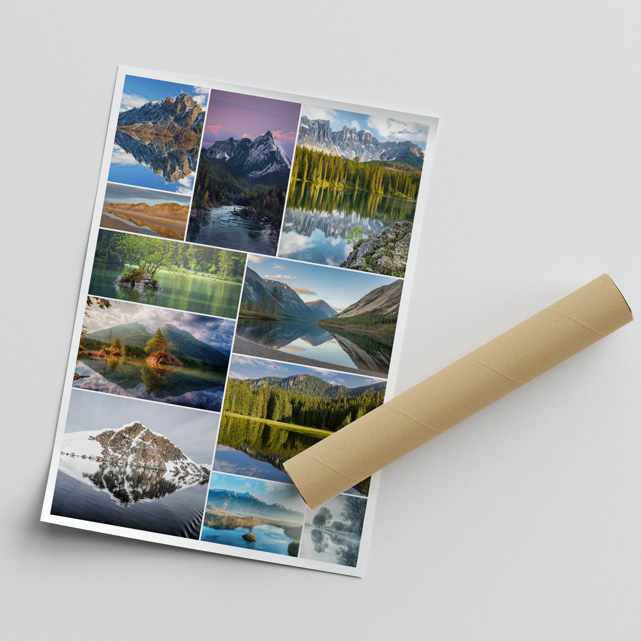 Collage de paisajes para impresión premium: playas, lagos y montañas. Crea el tuyo