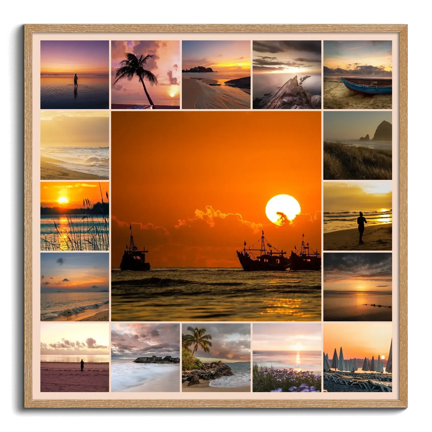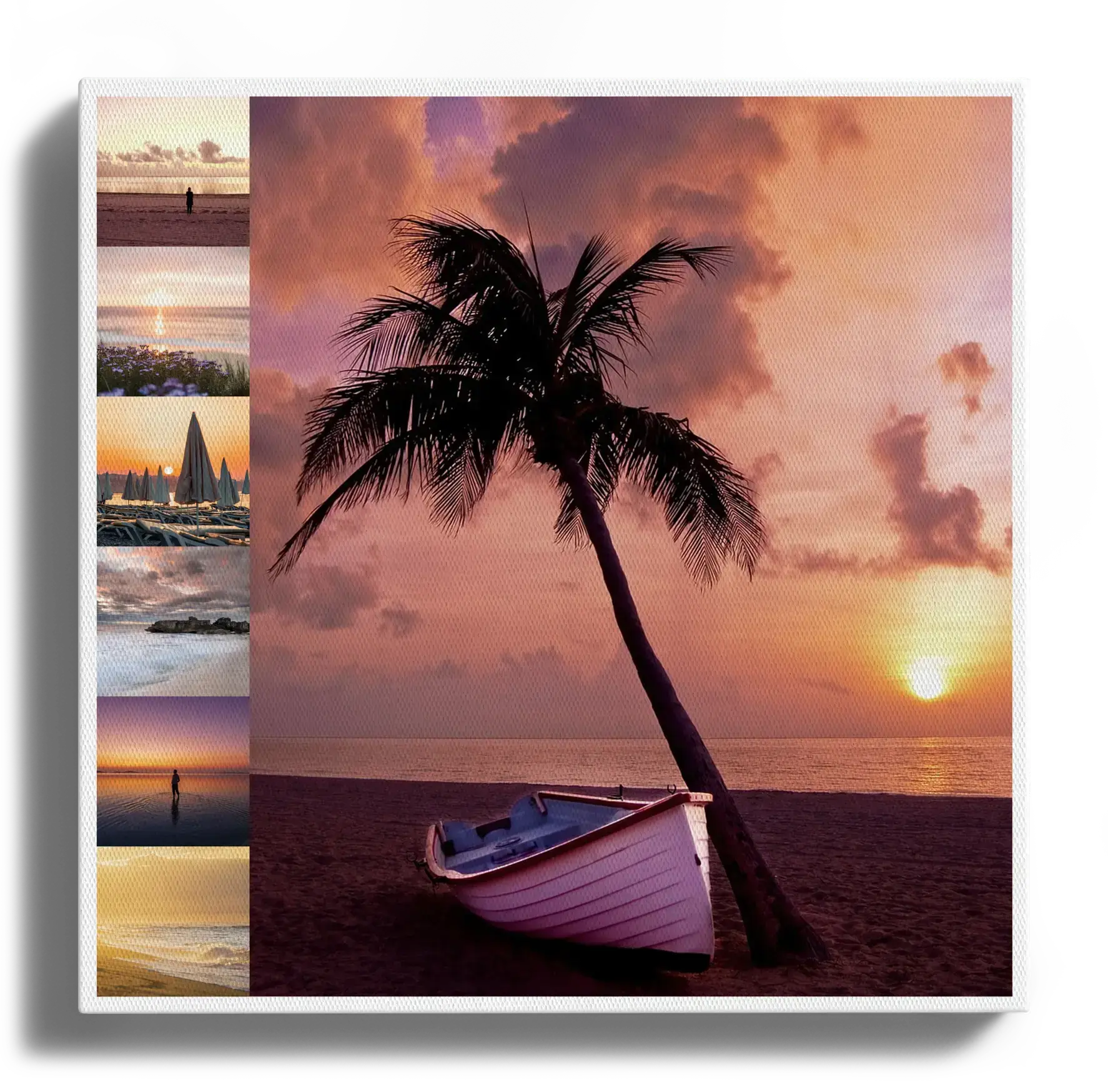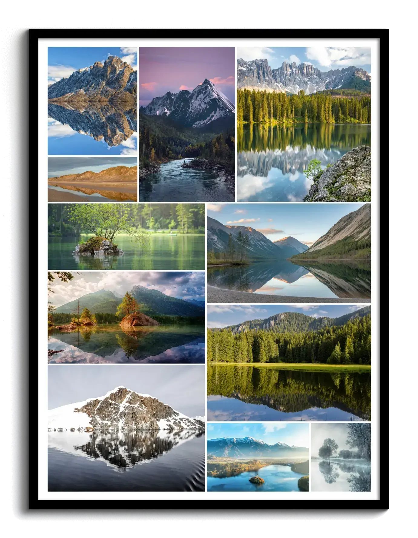 Crea ahora tu collage premium de paisajes. Reúne tus mejores escenas de playas al atardecer con palmeras y barcas y combínalas con lagos y montañas espejo, desde la frescura primaveral hasta cumbres nevadas en invierno. Elige plantillas variadas y obtén una impresión de alta calidad para tu pared.
