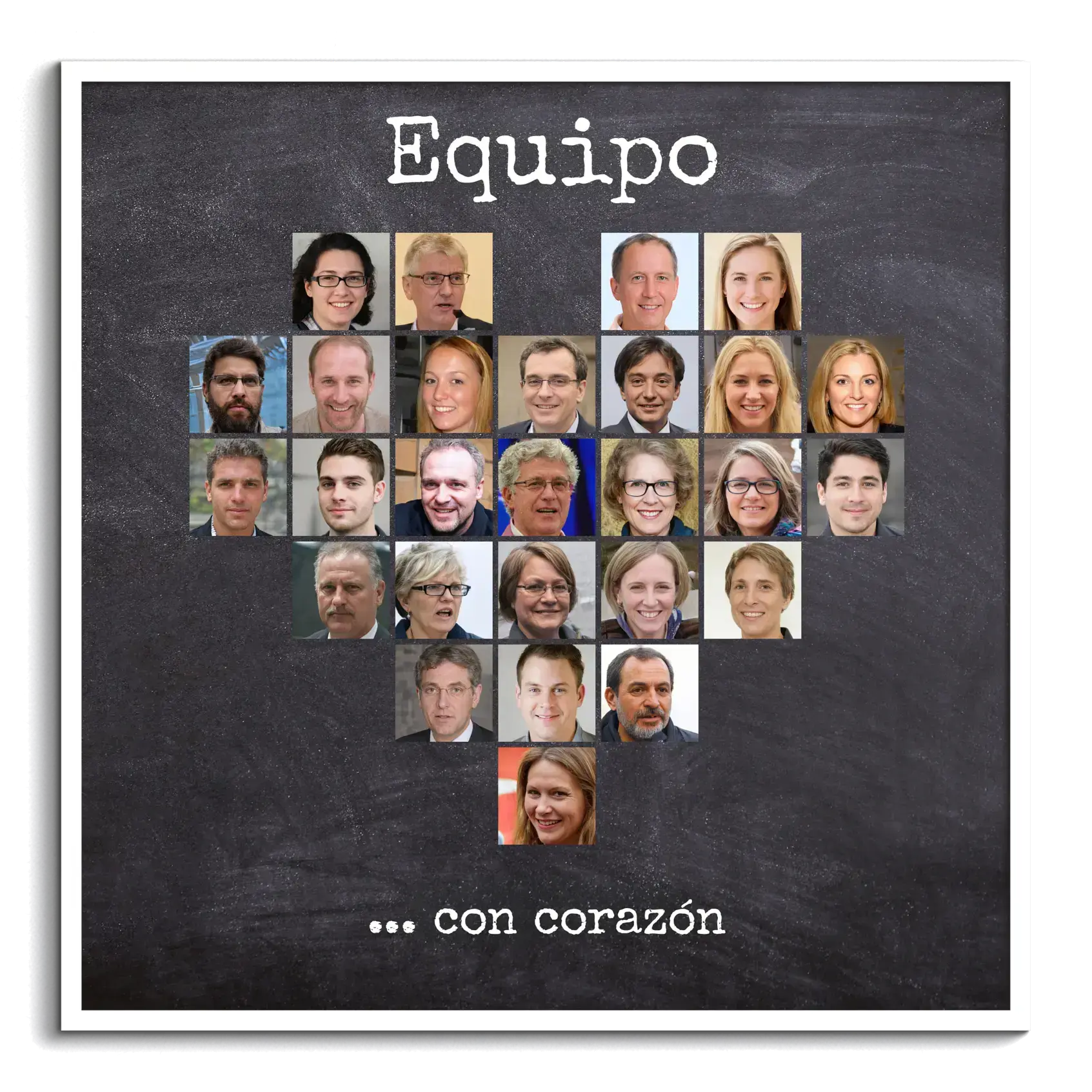 ¿Buscas un regalo especial y personalizado para un colega que se va? Crea una fotocollage en forma de corazón, perfecta como despedida. Personaliza las fotos del equipo con el mensaje "Team mit Herz" para dar ese toque único a tu obsequio. Cada foto de igual tamaño se acomoda ordenadamente, y puedes ajustar texto, colores de fondo y diseño a tu antojo.
