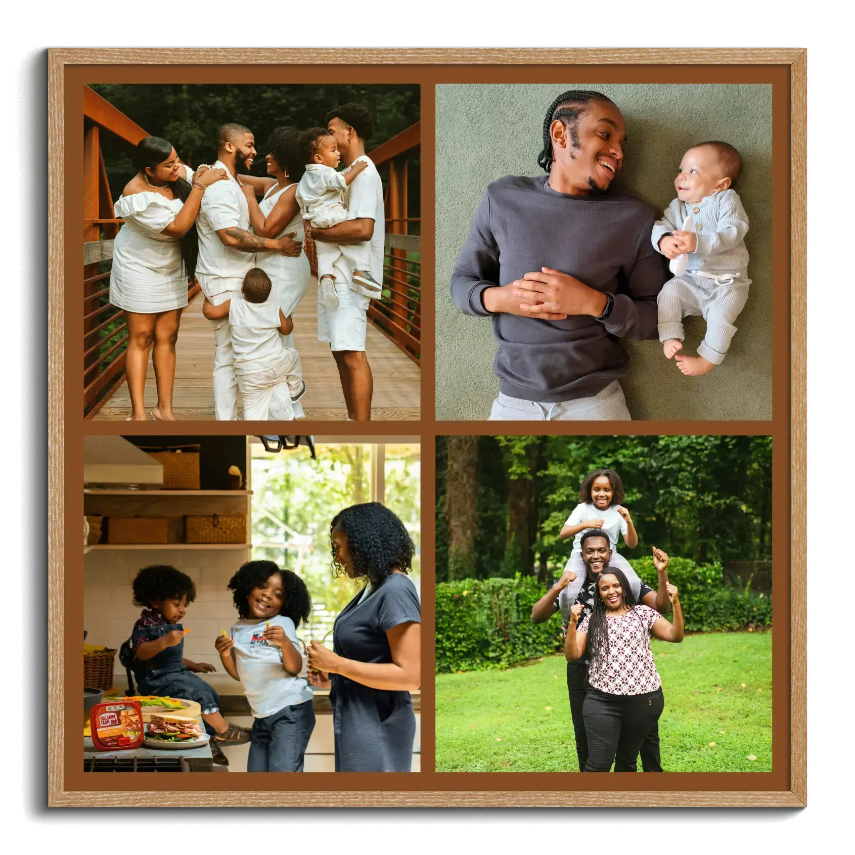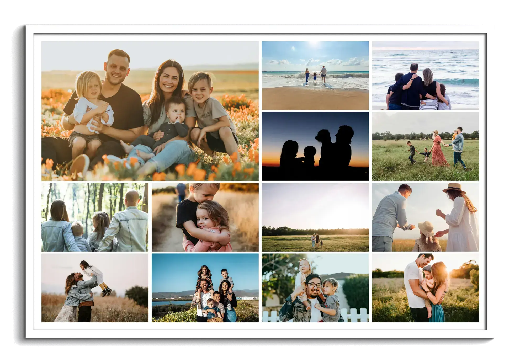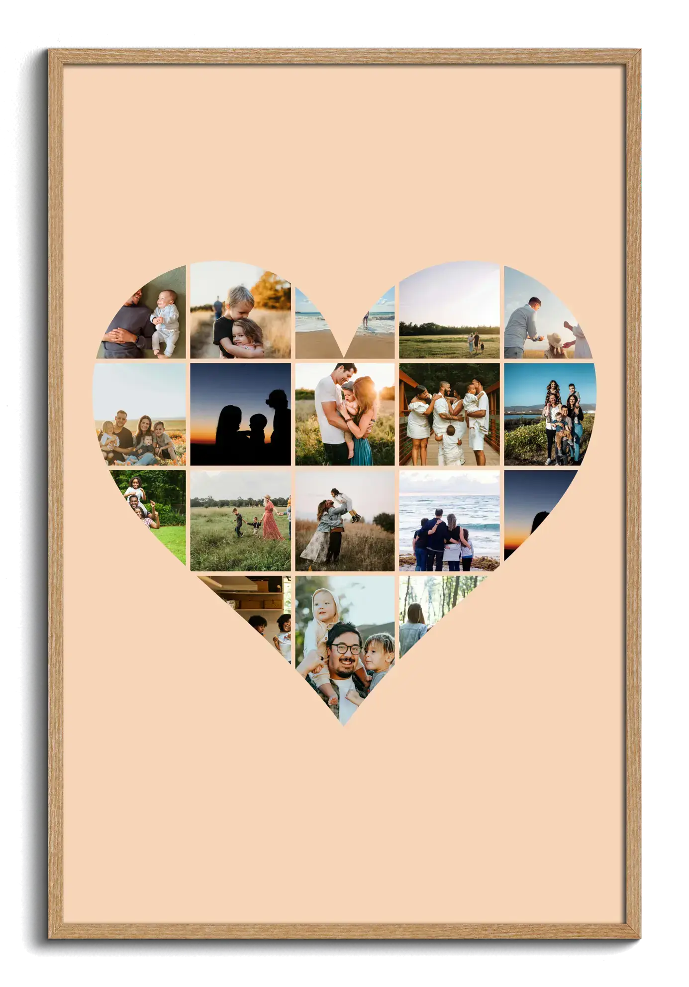 Empieza ahora y crea tu collage familiar único. Reúne fotos de tu familia en plantillas de cuadrícula, corazón o texto y compón una pieza llena de recuerdos. Añade títulos como Family Happiness, nombres y fechas, ajusta tamaños y colores y prepárala para imprimir en el formato que prefieras.
