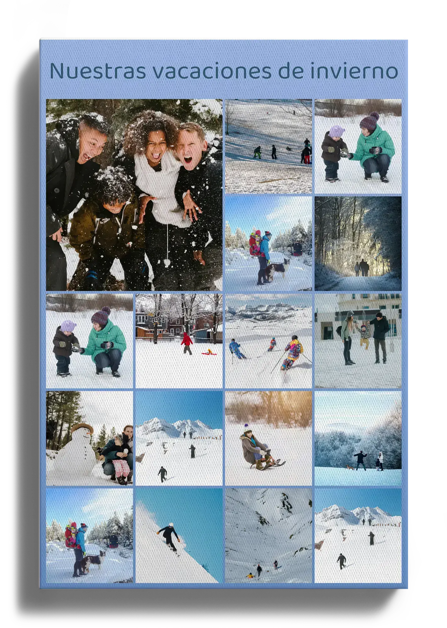 Collage invernales: paisajes y familia en nieve, personaliza con "Nuestro invierno".