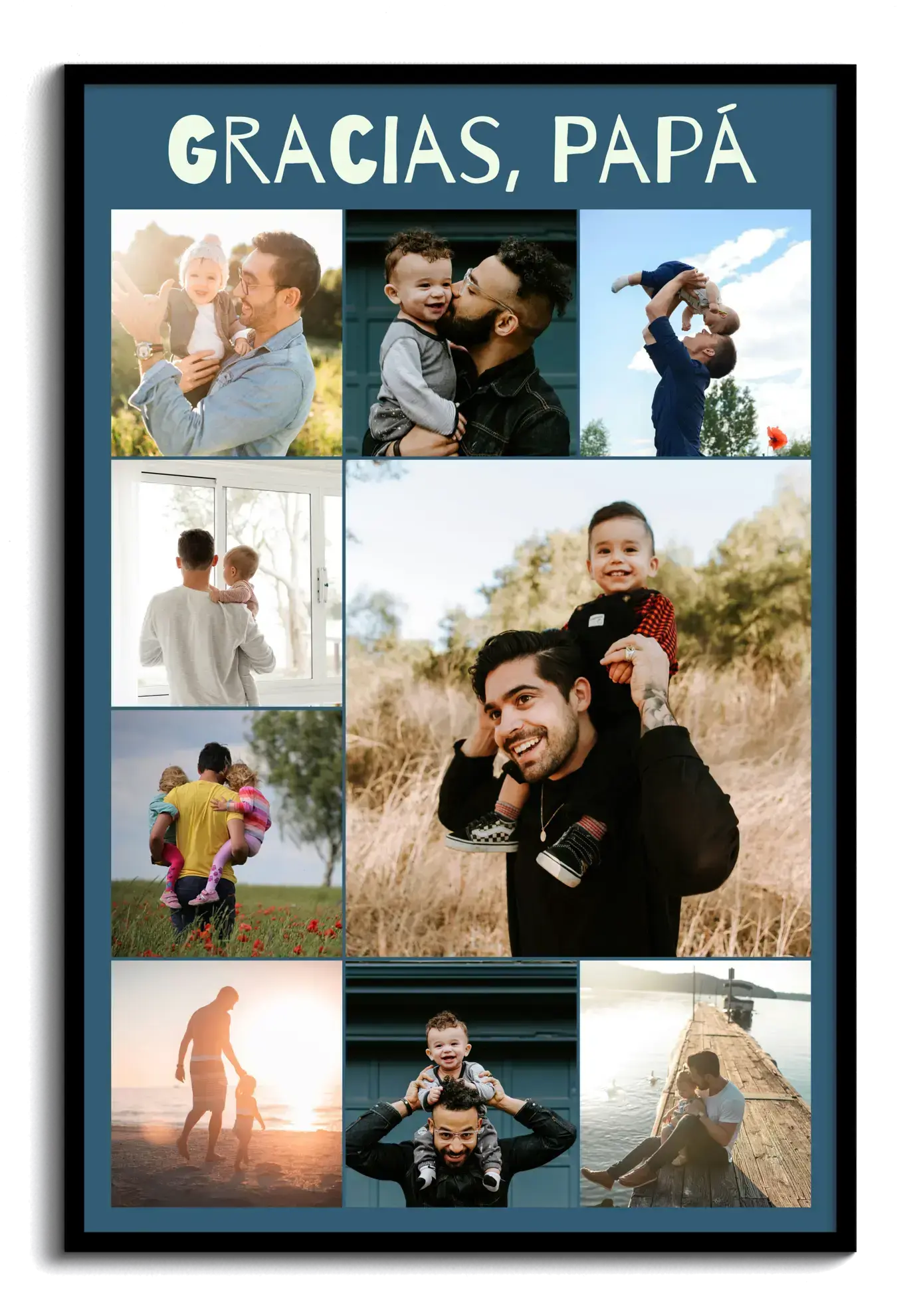 Empieza ahora y crea un regalo inolvidable para papá: reúne las fotos de los peques, de los nietos y de vuestras mejores vivencias en una lámina única. Elige entre plantillas variadas y añade un mensaje personal como Gracias papá. Pídelo al instante en el tamaño y material que prefieras.