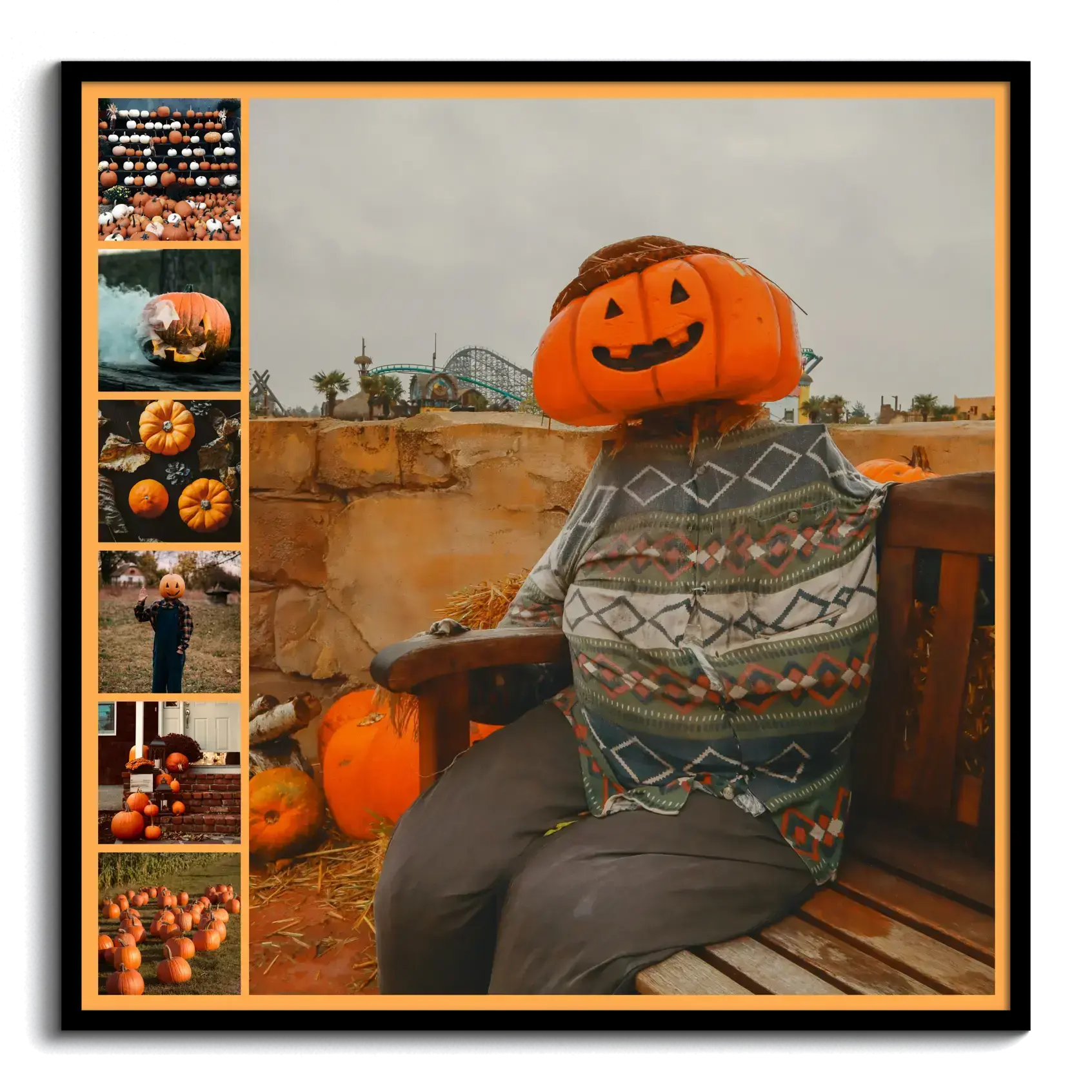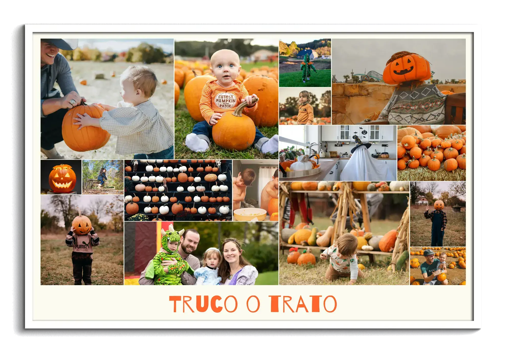Crea collages de Halloween con disfraces y decoraciones personalizadas, como calabazas y textos.