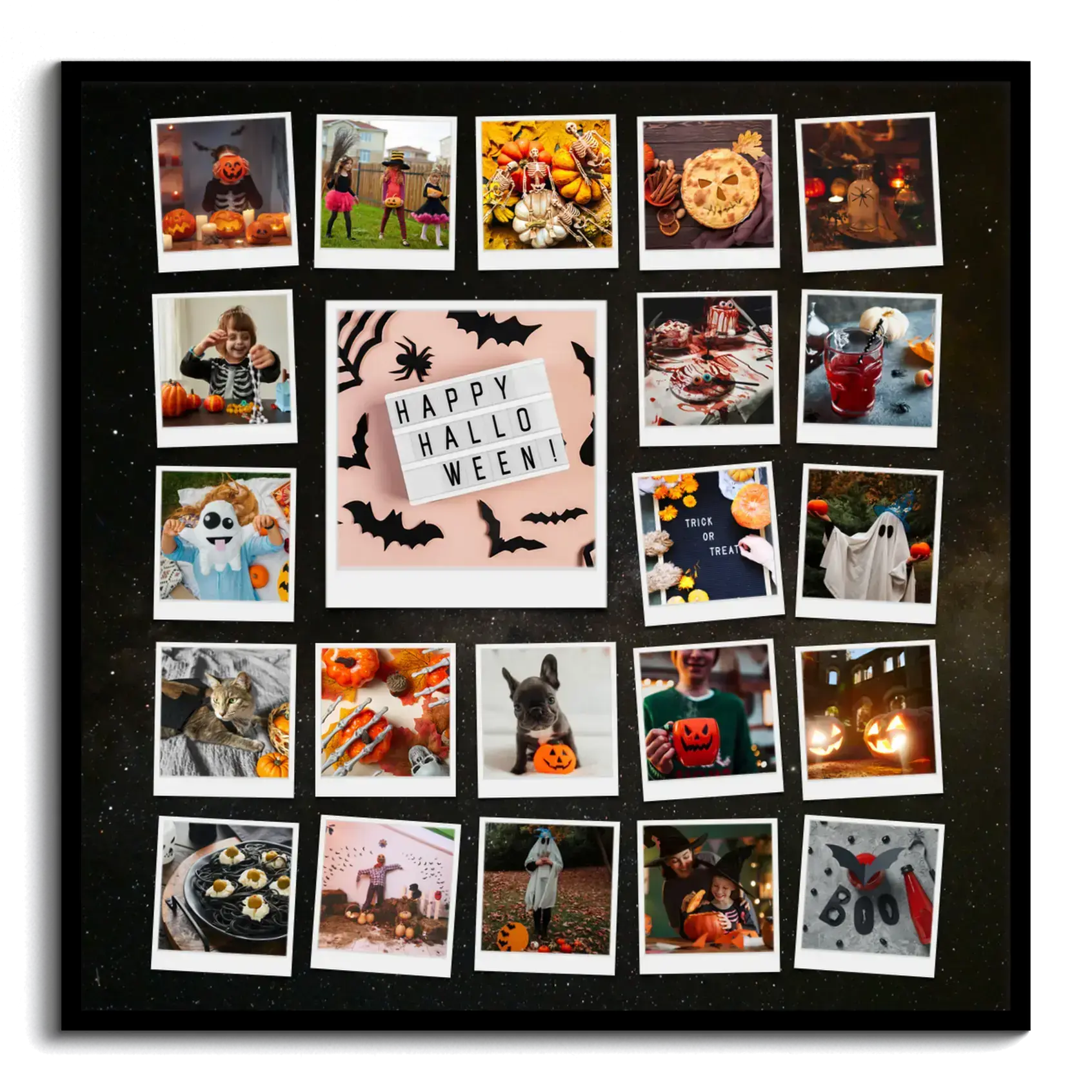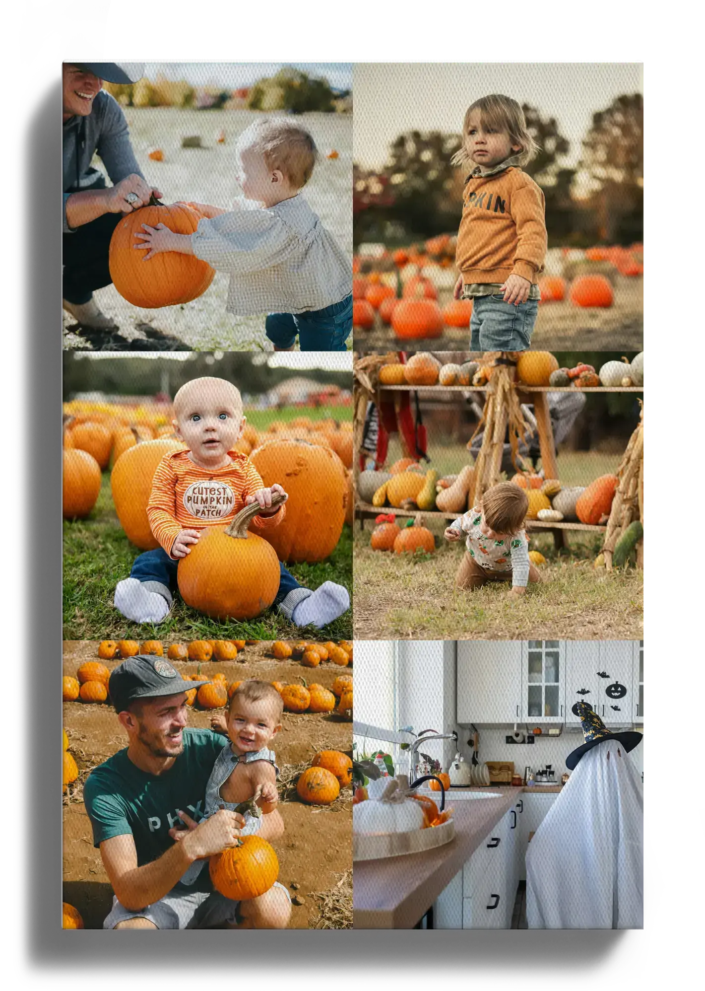 ¡Dale vida a tus recuerdos de Halloween creando una fotocollage personalizada con tus fotos favoritas! Con nuestro fácil de usar editor web, puedes diseñar collages encantadores de tus momentos especiales con familiares disfrazados de fantasmas o monstruos, junto a calabazas decoradas. Añade un toque personal incluyendo textos como "Süßes oder Saures" para hacer tu collage aún más único.