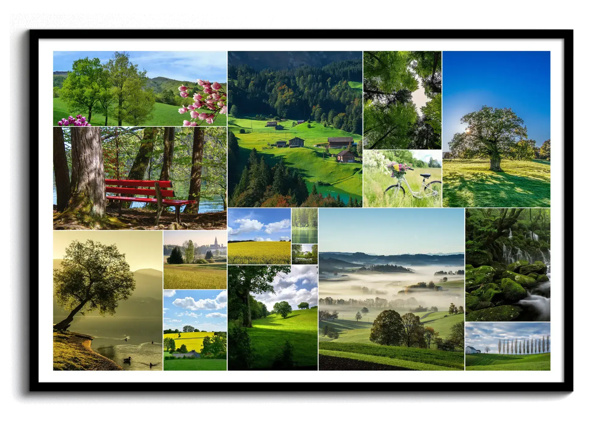 Paisajes de bosques, cumbres nevadas y praderas en collages con impresión premium.