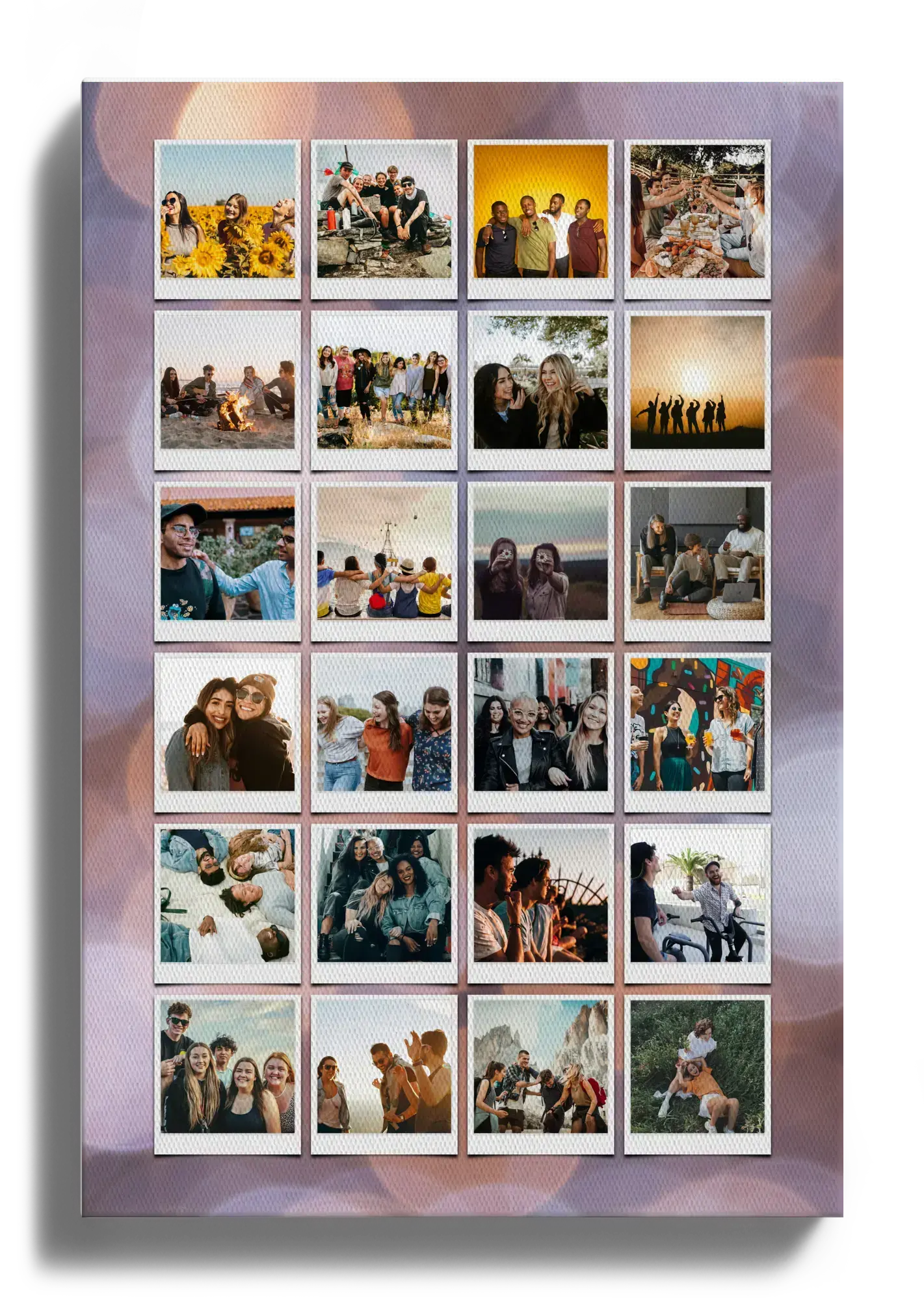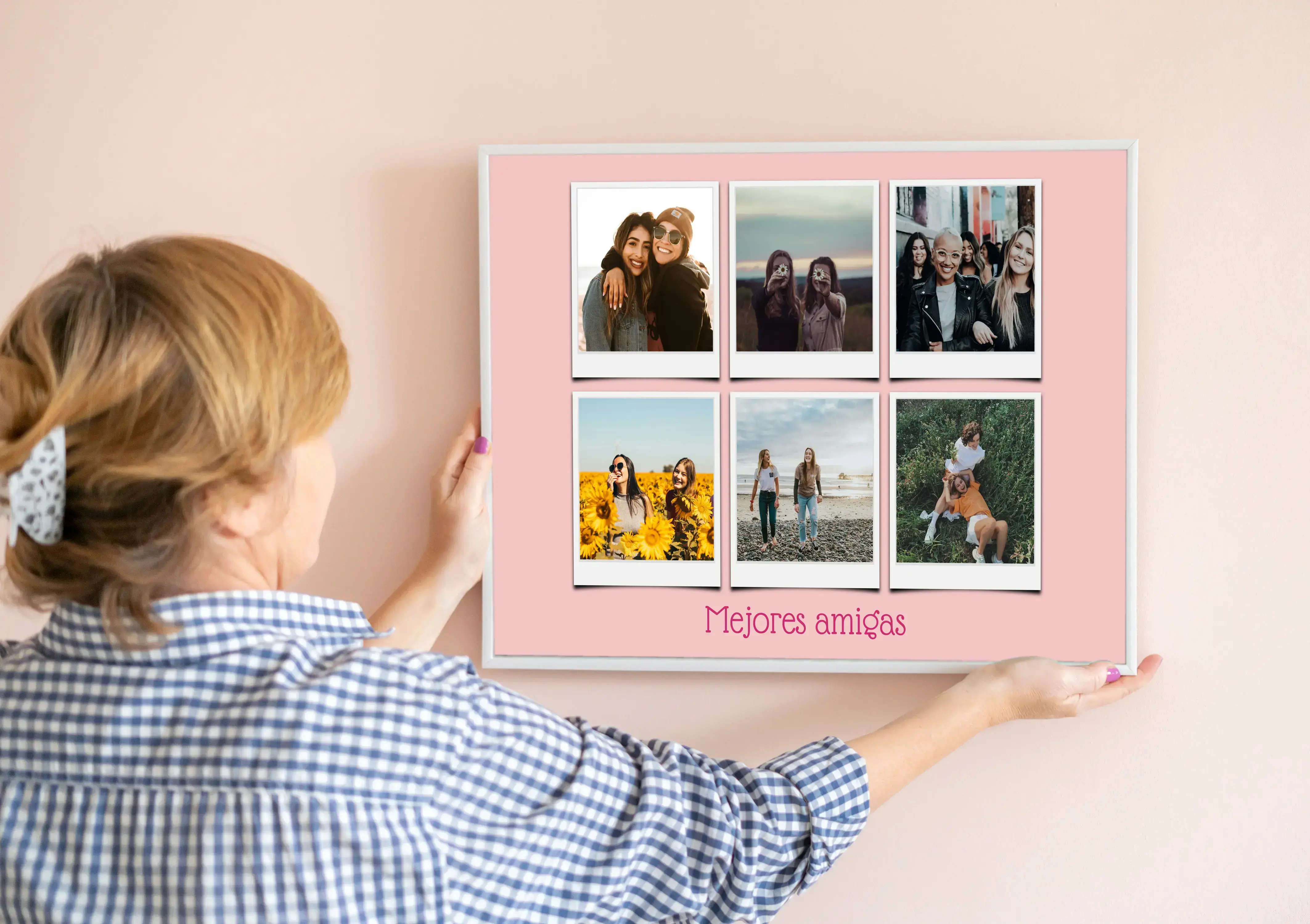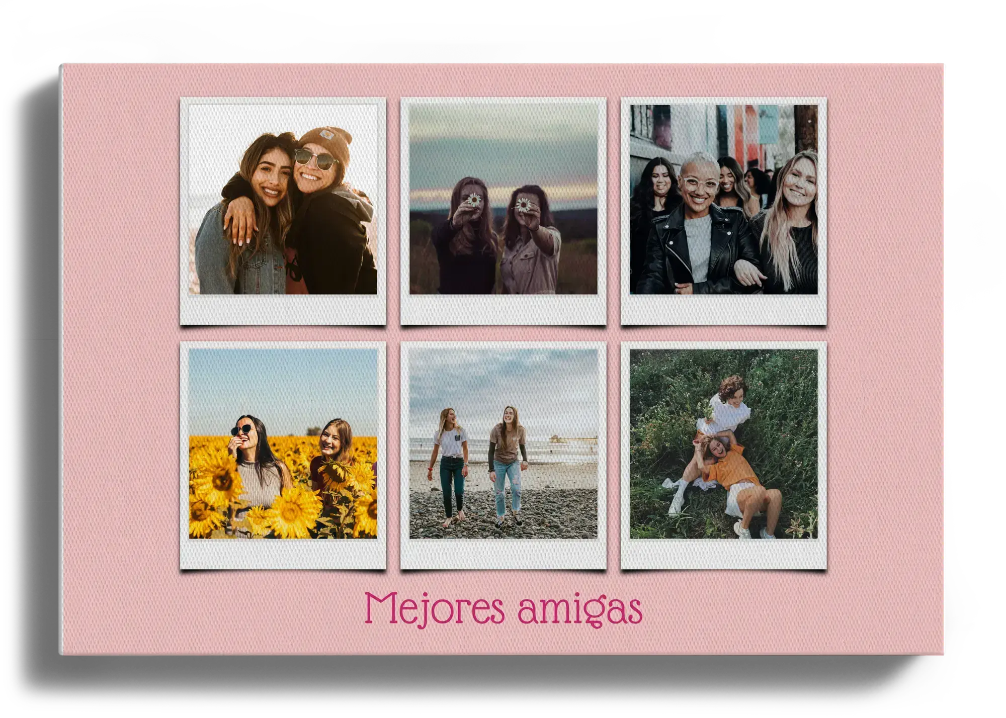Crea tu propia obra maestra con nuestra fotocollage personalizable. Imagina una bonita colección de fotos de amigos y amigas dispuesta en una elegante plantilla de estilo Polaroid. Añade tus propios textos como "Mejores amigas" y transforma tus recuerdos más preciados en un regalo visual único y lleno de emoción.